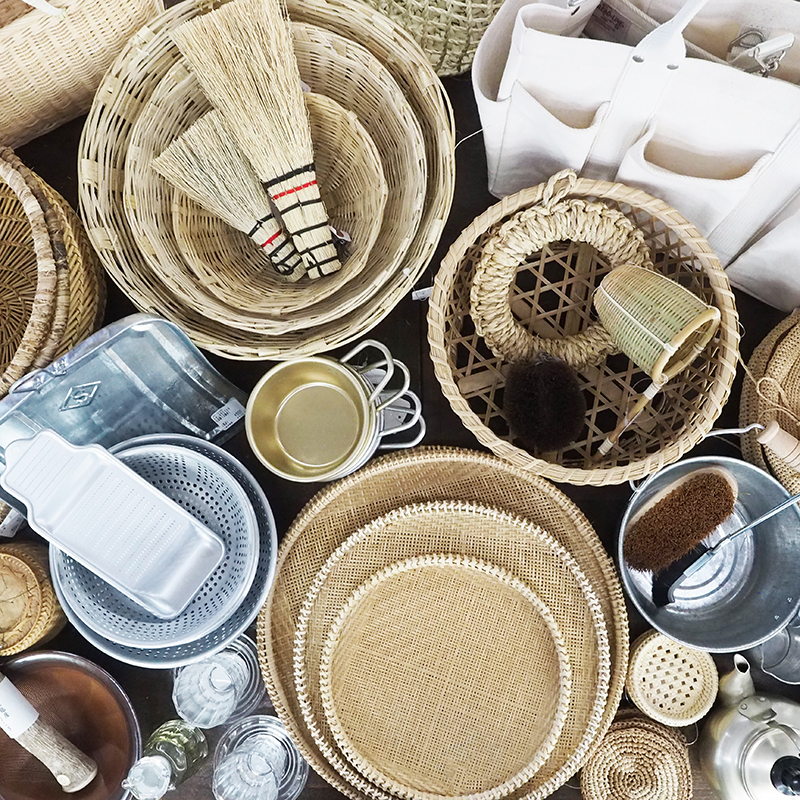 松野屋さんは1945年創業、現在は自然素材を中心とした生活道具をあつかう荒物問屋。荒物という言葉自体、近ごろあまり耳にしなくなりましたが、ほうき、ちりとり、ざるなど、ちょっと前まではどこにでもあった簡単なつくりの日用品のこと。garageでは常設で商品を展開しています。