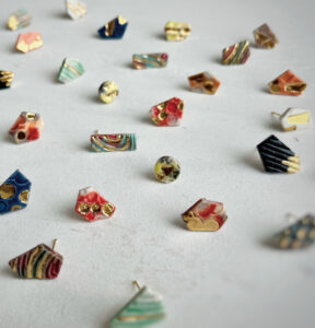 いろいろな色、形、模様の陶の装身具を主に制作。自身で描いた模様を押し、自然に溶け込む色、錆や黴のような色、季節にあわせた色、その日の気分など、感じたままに絵を描くように色をつけています。色も形も模様もちがう、たくさんのものの中からお気に入りの一点を見つけてください。