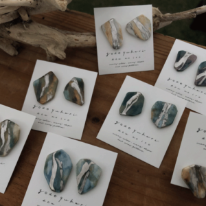 いろいろな色、形、模様の陶の装身具を主に制作。自身で描いた模様を押し、自然に溶け込む色、錆や黴のような色、季節にあわせた色、その日の気分など、感じたままに絵を描くように色をつけています。色も形も模様もちがう、たくさんのものの中からお気に入りの一点を見つけてください。
