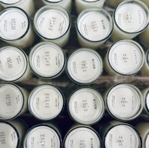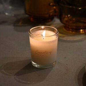 ひとつひとつ丁寧に手づくりされた、環境に優しいソイワックス100%のキャンドルが並びます。空気清浄効果があり、ススも出にくいため、お子さんやペットとの暮らしに灯しても安心です。