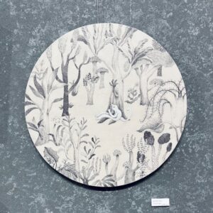 絹糸の如く細く繊細な線で描かれた人や動物たちは、思い思いに植物のある風景のなかに佇みます。