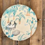 絹糸のように細く繊細な線で描かれた人や動物たちは、思い思いに植物のある風景のなかで佇みます。
