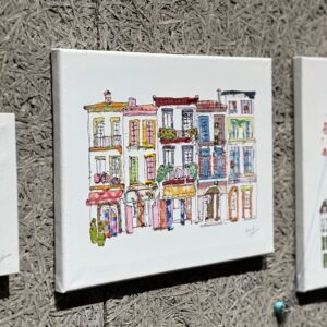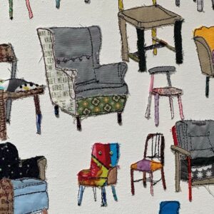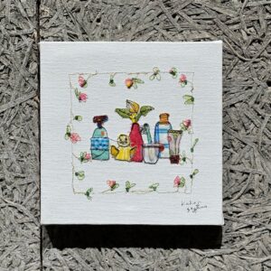 キャンバスに刺繍を施しながら布やビーズなどをコラージュした作品は、色彩豊かで楽しい気分にさせてくれます。とても繊細なので、ぜひじっくりと近くでご覧ください。