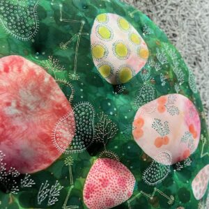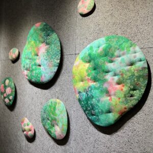 染めた布に更に模様を重ね、モコモコとしたオブジェにした作品など。優しい色合いで春らしい空間になりました。ぜひ穏やかな時間をお過ごしください。