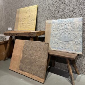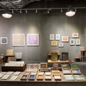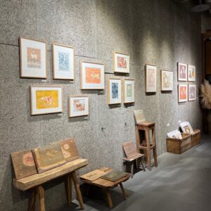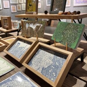 版画のハギレを使用した葉書や栞、またゴム版画によるポストカード。額に入っていない版画や、マット紙に挟んだ版画などもご用意しております。同じ絵柄でも配色が違いますので、たくさんある中からお好みの絵柄、色合いをお選びいただけます。