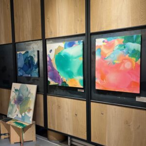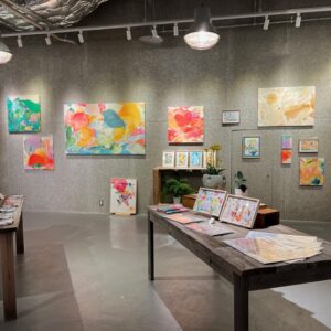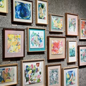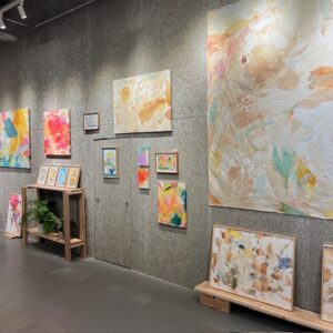 2年ぶり、ユイステファニーさんの個展です。いつものように春らしい清々しく華やかな空間です。歌うように踊るように風に乗って筆が走り、色が染まっていく。そんなイメージの絵画たち。