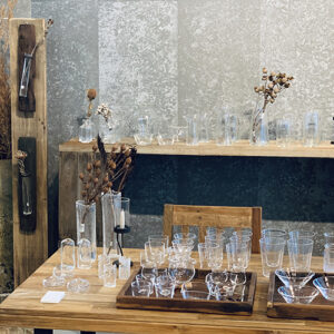 硝子の美しさと同時に、暮らしのなかで使うことの楽しみを教えてくれるヤマノネ硝子さんの吹きガラスの食器や花器、様々な用途に使えるベースが並びます。佇まいの凛としたガラスシェードの照明器具も多数展示販売します。
