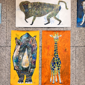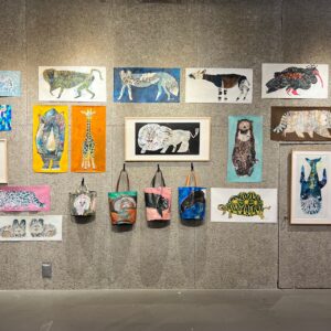 キャンバスに動物や植物を、イキイキとした線で描く坪井さん。エネルギー溢れる作品は元気を与えてくれます。