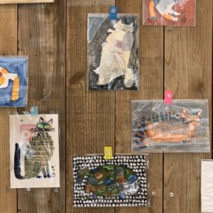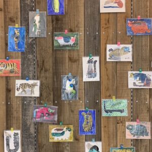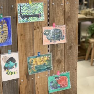 イキイキとした自由な線と色で、たくさんのネコ達が描かれています。いつもは、様々な動物の絵を描く作家さんですが、今回の展示はネコ限定。