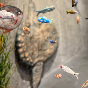 garageでは2回目となる展覧会。今回のテーマは「海」です。メインとなるのは、鳥羽水族館にいるジュゴンのセレナと、カメ吉。幼少期はとても仲が良く一緒の水槽にいた2匹ですが、現在は別々の水槽で暮らしています。そんなセレナとカメ吉の周りにはたくさんの海のいきものが集まり、それぞれに群れをつくり楽しそうに泳いでいます。