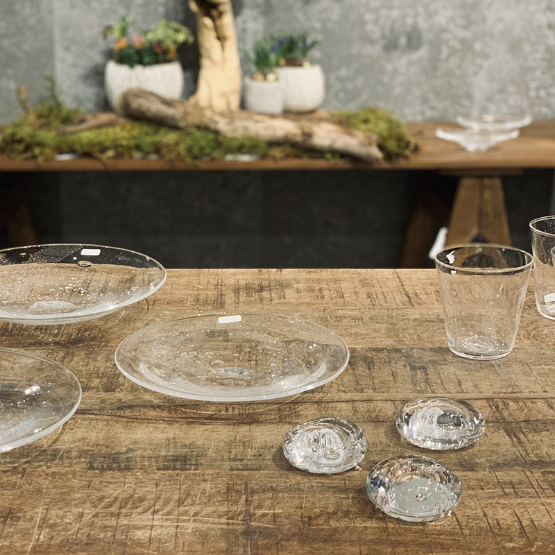 栗原さんの作品の見どころはガラスに淡く浮かびあがる小さな気泡の粒たちです。