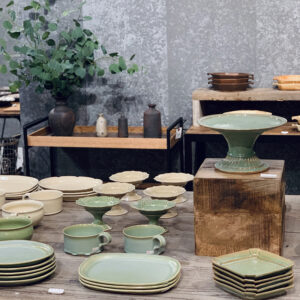 植物の色を思わせるような緑の釉薬やロウ引きの技法で描き出されるモノクロームの模様が、載せる物を美しく演出します。