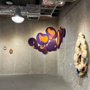 主に自ら染色した布を縫い合わせた作品を制作している。絵の具と違い厚みや筆致を残さず色彩だけを染み込ませた布を縫って表面を整える方法は、あらゆるものが醜く生臭い部分を人目から隠して表面を整えているこの世界のようでもある。