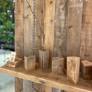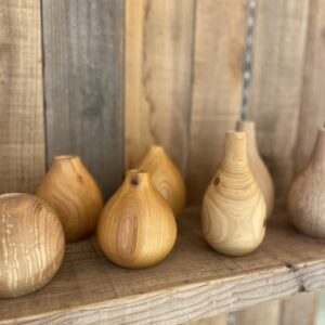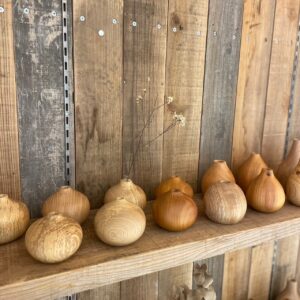 手に馴染む磨きがかかった曲線の花器、木肌を生かした花器など、木の温もりを感じられる素敵な作品が並びます。ひとつひとつの木目も違いますので、手にとってご覧ください。