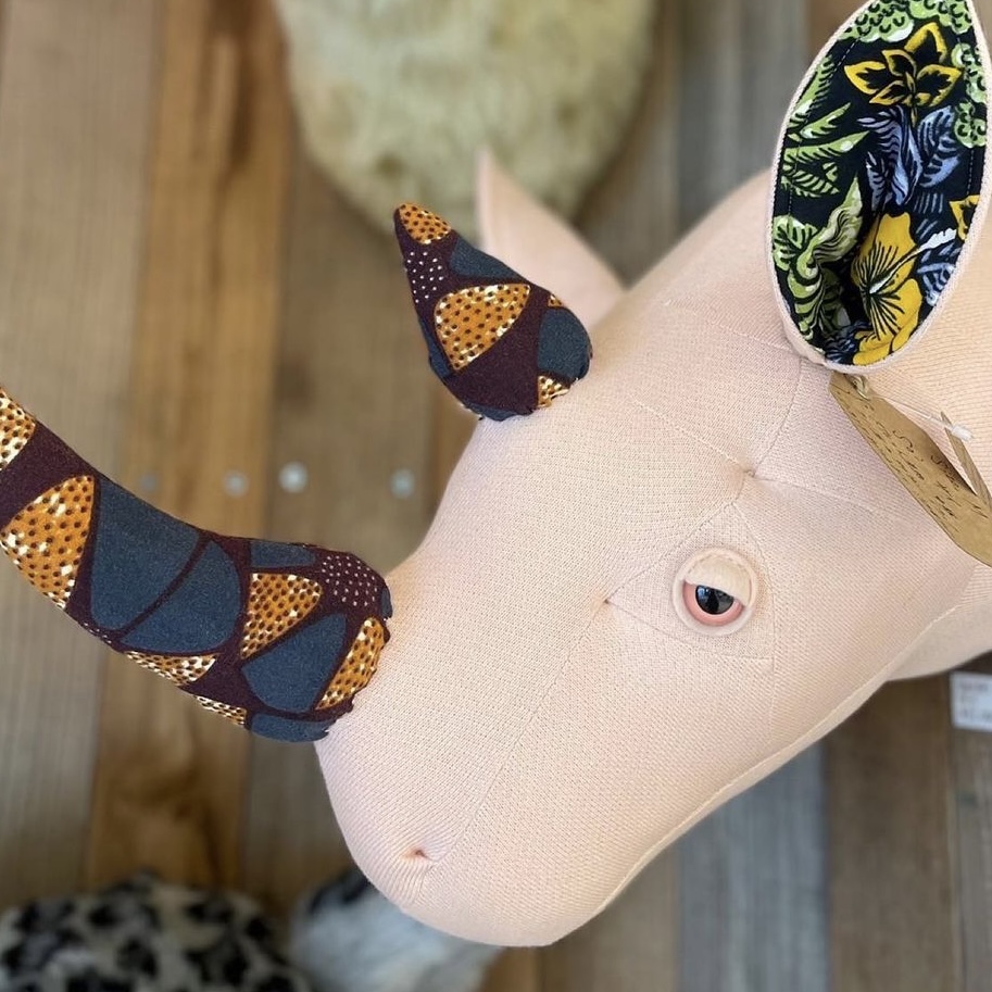 アニマルトロフィーとは、壁に飾る動物のオブジェです。作家のHande und Stitch・花村さんは、ヴィンテージのファブリックなどを使いオリジナルのアニマルトロフィーを作ります。