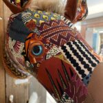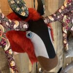 アニマルトロフィーとは、壁に飾る動物のオブジェです。作家の花村さんは、ヴィンテージのファブリックなどを使いオリジナルのアニマルトロフィーを作ります。