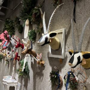 つぶらな目をした動物たちが、ガレージオリジナルのリースやスワッグと共に壁を彩ります。