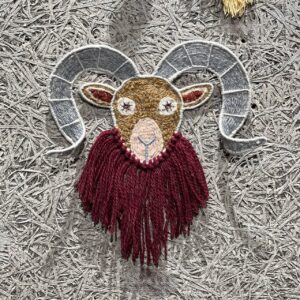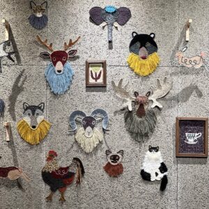 毛糸をミシンで縫い合わせて作り出された、まだ出会ったことのない魅力的な作品です。どこか異国の雰囲気が漂う個性的な顔つきの動物たちが、所狭しと並びます。