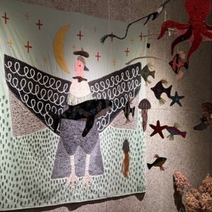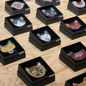 壁面の作品をご購入の際は、お渡しが9月頭になります。すぐにお持ち帰りいただける小さな作品(バッチ)も販売しております。どうぞお立ち寄りください。