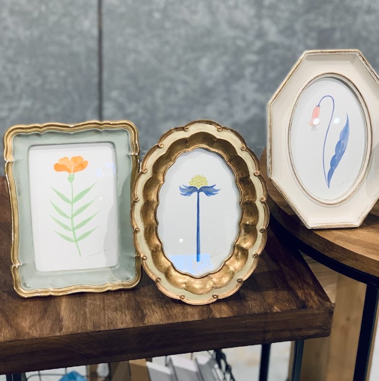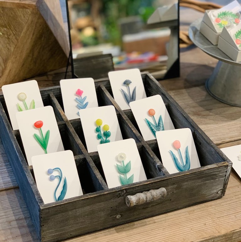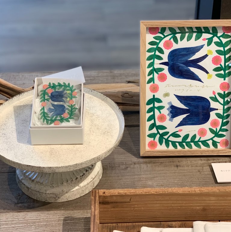 瑞々しく透明感ある水彩画を原画に、花や鳥モチーフのペーパー作品・ハンカチやTシャツなどのテキスタイル作品、アクセサリーなどが並びます。