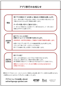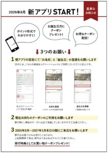 アプリ会員の皆さまへ 日頃よりご利用、誠にありがとうございます。2026年8月に、新アプリへの移行をおこないます。