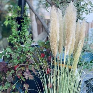 なかでもパンパスグラスは、グラスの代表格です。たっぷりとした箒のような穂が特徴で、穂のない時期でも1~3mにもなる存在感ある姿がアクセントとなりお庭を引き締めます。
