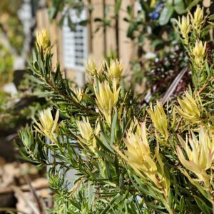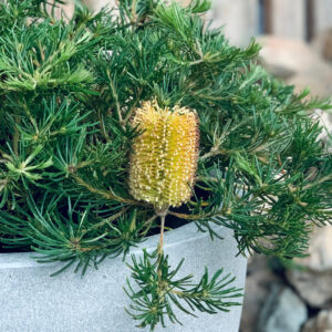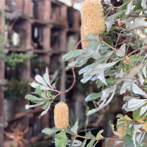 バンクシアもまた、その個性的な姿が魅力です。ブラシのようにふさふさした見た目の花はもちろん、鋸状や針状の葉がオーナメンタルで目を惹きます。