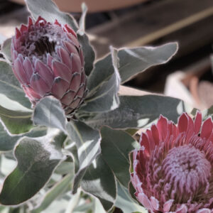 プロテアは花びらのような総包が鱗状に重なり合う様子が見事です。なかでも格別大きな花をつけるキングプロテアは、王様の名にふさわしい堂々たる姿です。