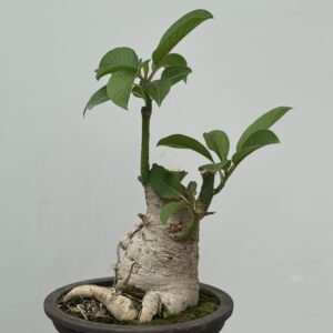オンブー(Phytolacca dioica)は南アメリカ原産のヤマゴボウ科の植物で、ウルグアイでは国樹にもなっています。自生地では樹高15mほどに育つ大型種ですが、鉢植えではコンパクトに楽しむことができ、海外では盆栽仕立ても親しまれています。直射日光が大好きで成長が早く、夏にはぐんぐん葉を広げる姿が見ごたえ抜群。剪定後の芽吹きも早く、実生株では地中部分が塊根化するのも大きな魅力です。
