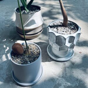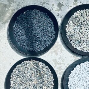 例えば、鉢の色がブラック系の時、白い化粧砂利は反対色のためコントラストがはっきりと出て砂利がより目立ちます。反対に黒やグレーの化粧砂利は同系色のため、トーンが馴染み落ち着いた印象にまとまります。