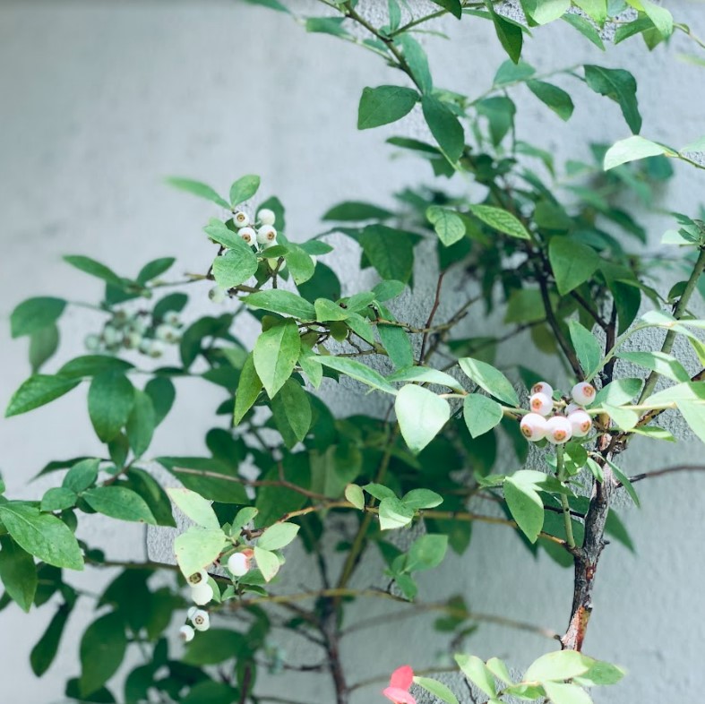 春に満開の花を咲かせた木々は、今では鈴のような緑色の実を木陰で揺らしています。ジュンベリーはすでに収穫の時期を終えましたが、ブルーベリーやブラックベリーは今が旬、そして秋に熟すノブドウは今からその色づきが楽しみです。