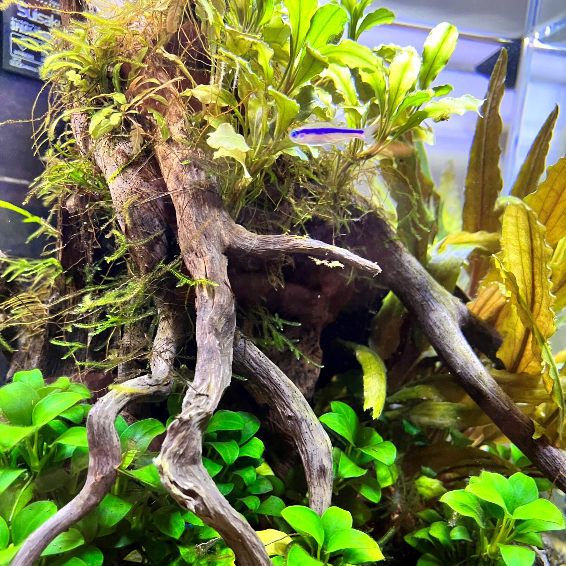 原因はいまだにわからないけれど、数年前の冬のある日、彼女は天に召されました。その後、残された彼女の立派な幹は、ベランダの風雨に半年耐え、流木のような風合いに変化し、そして室内のアクアリウム水槽の中で流木として水景を彩ってくれています。